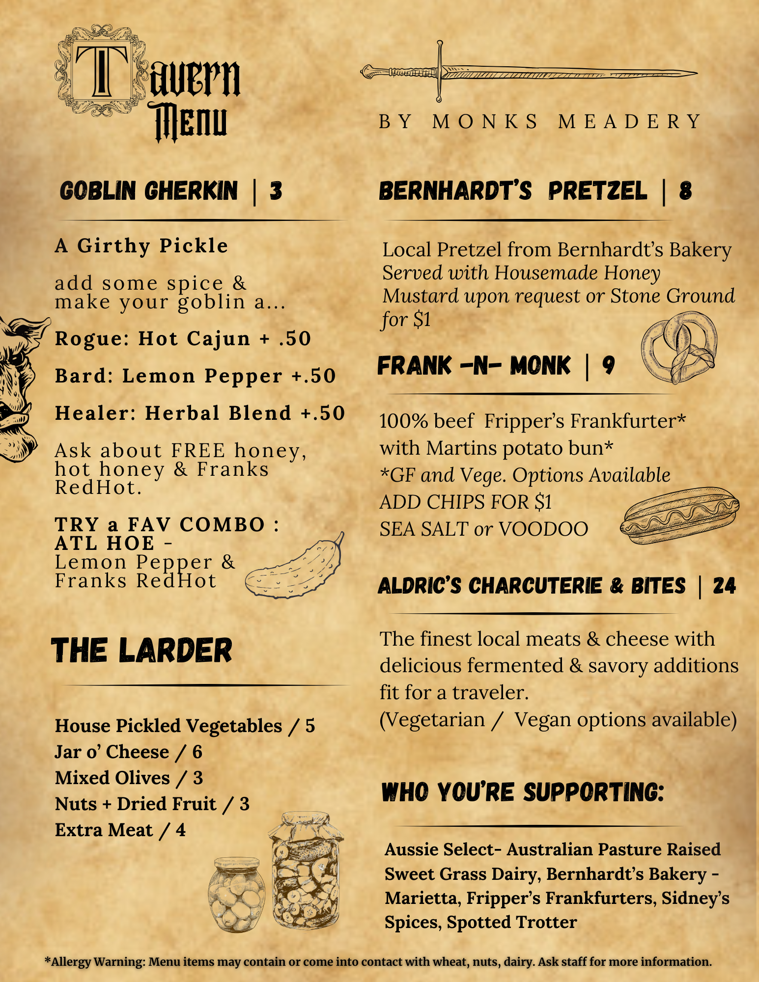 Experience the 12 meads we have on tap and our Tavern Food Menu. (Vegan & Gluten Free Options Available)